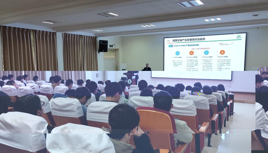 “烏卡時代下,我們的養殖企業如何活下來?”劉向東博士開門見山,向與會師生詳細分析了我國生豬産業發展現狀及趨勢。他指出,在這個充滿易變性、不确定性、複雜性和模期性的行業市場中,生豬産業正面臨着巨大的挑戰,産業規模化、标準化、一體化、智能化高質量發展是必然趨勢。