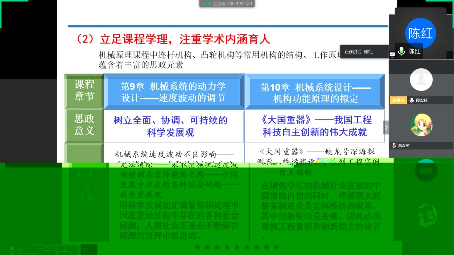 陳紅老師介紹了她在《機械原理》授課中如何挖掘思政融入點、讓專業技能和價值引領同向同行的心得體會。從“合理約束限制機械構件的自由度”引申出“自由與約束(紀律、道德、規則)之間的關系”,從“采取措施機械運轉速度波動控制在容許範圍之内”引申出對“新發展理念”的理解思考,她的課程思政設計“潤物細無聲”地穿插在各章節知識點中,令人拍案叫絕。