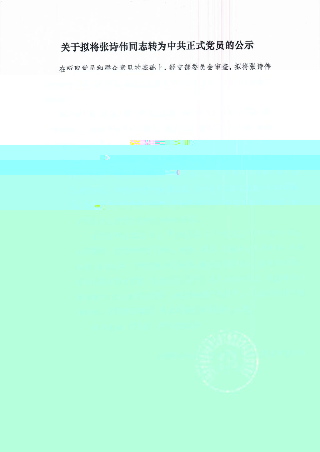 【研】關于拟将張詩偉同志轉為中共正式黨員的公示