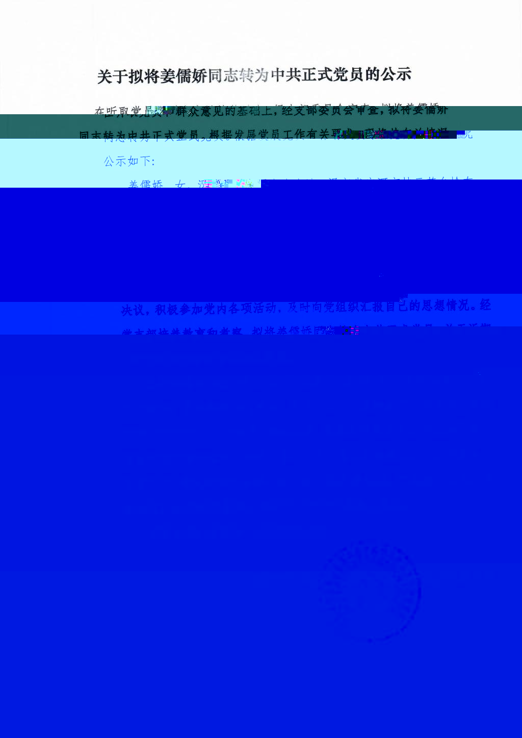 【研】關于拟将姜儒嬌同志轉為中共正式黨員的公示