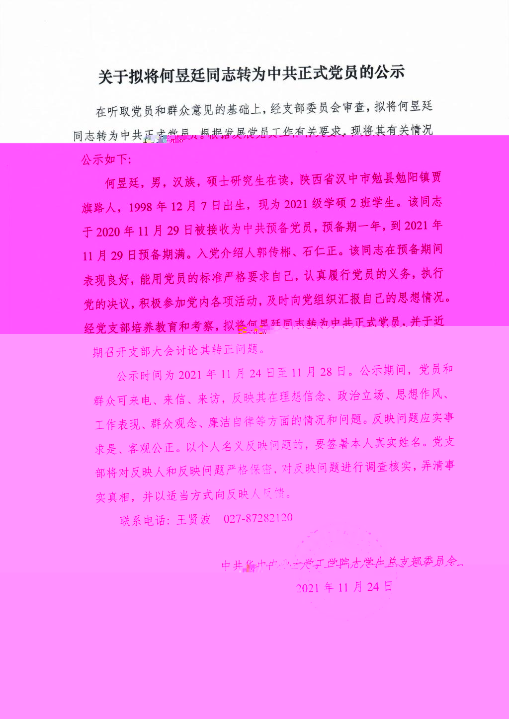 【研】關于拟将何昱廷同志轉為中共正式黨員的公示