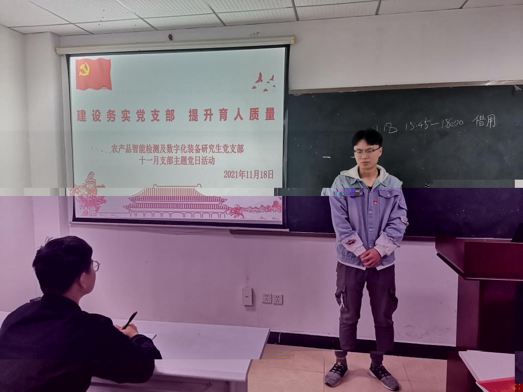 2021年11月18日,為加強思想建設,學習貫徹黨的十九屆六中全會精神,yl7703永利農産品智能檢測及數字化裝備研究生黨支部在工程樓B620會議室開展“建設務實黨支部,提升育人質量”主題黨日活動。