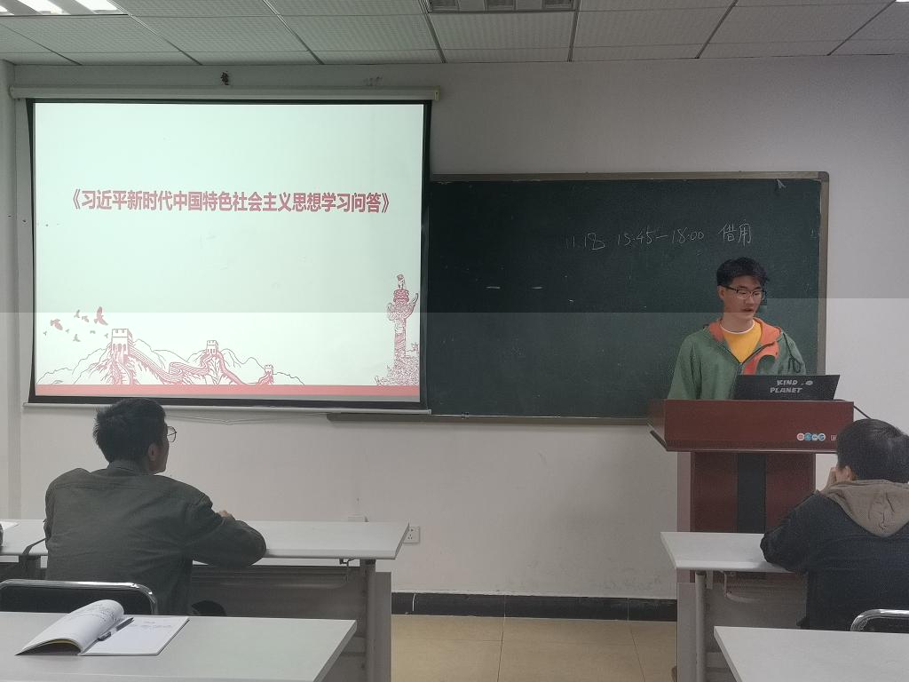 為加強對積極分子的培養教育、增進支部内同志的交流互動,邀請田文強同志參加主題黨日,他在學習後分享心得體會。他談到,習近平總書記告訴我們,自1840年鴉片戰争以後,中國逐步淪為半殖民地半封建社會,國家蒙辱、人民蒙難、文明蒙塵,中華民族遭受前所未有的劫難。從那時起,實現中華民族偉大複興,就成為中國人民和中華民族最偉大的夢想。而我們作為新時代的研究生,更要擁護以習近平同志為核心的黨中央領導集體,堅持黨的領導地位,團結全黨全國各族人民的力量,為實現中華民族偉大複興的中國夢不懈努力。