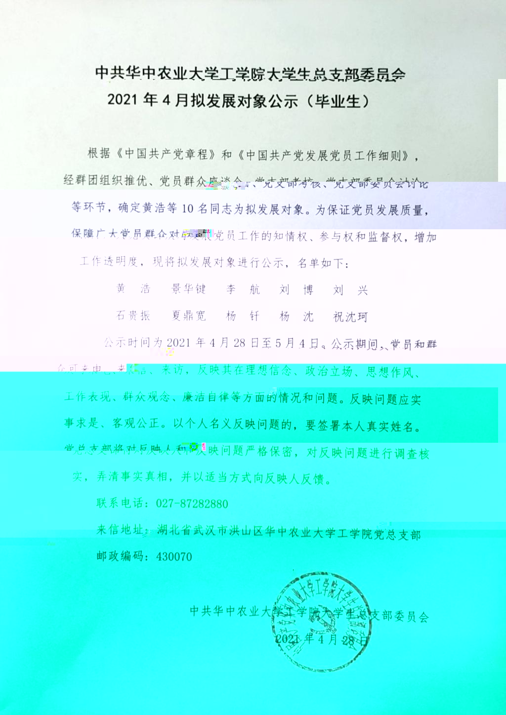 中共yl7703永利大學生總支部委員會2021年4月拟發展對象公示(畢業生)