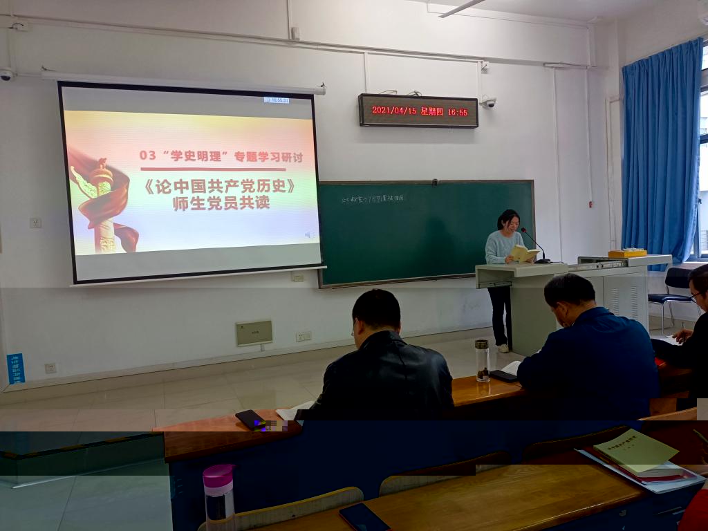 “學史明理”專題學習研讨的第三部分,由宗望遠、楊揚、蔔祥利、王寶麗等9位師生黨員共同誦讀《論中國共産黨曆史》各篇章。宗望遠同志表示,在建黨一百周年來臨之際,我們隻有認真學習黨史,才能夠更加自信、更好地将以往的經驗用于未來的發展之中。正如習總書記在黨史學習教育動員大會上指出,回望過往的奮鬥路,眺望前方的奮進路,必須把黨的曆史學習好、總結好,把黨的成功經驗傳承好、發揚好。認真學習黨史,才能在曆史中汲取精神力量,為實現“中國夢”注入無限生機和活力。