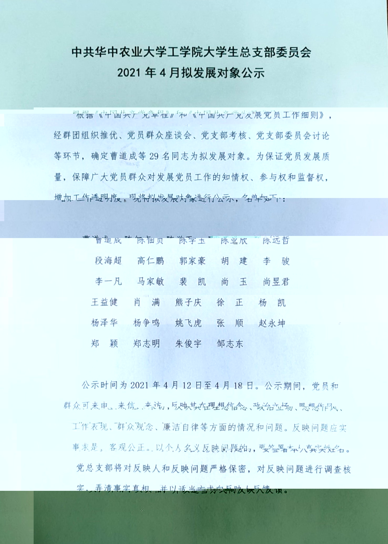 中共yl7703永利大學生總支部委員會2021年4月(上半年第一批)拟發展對象公示