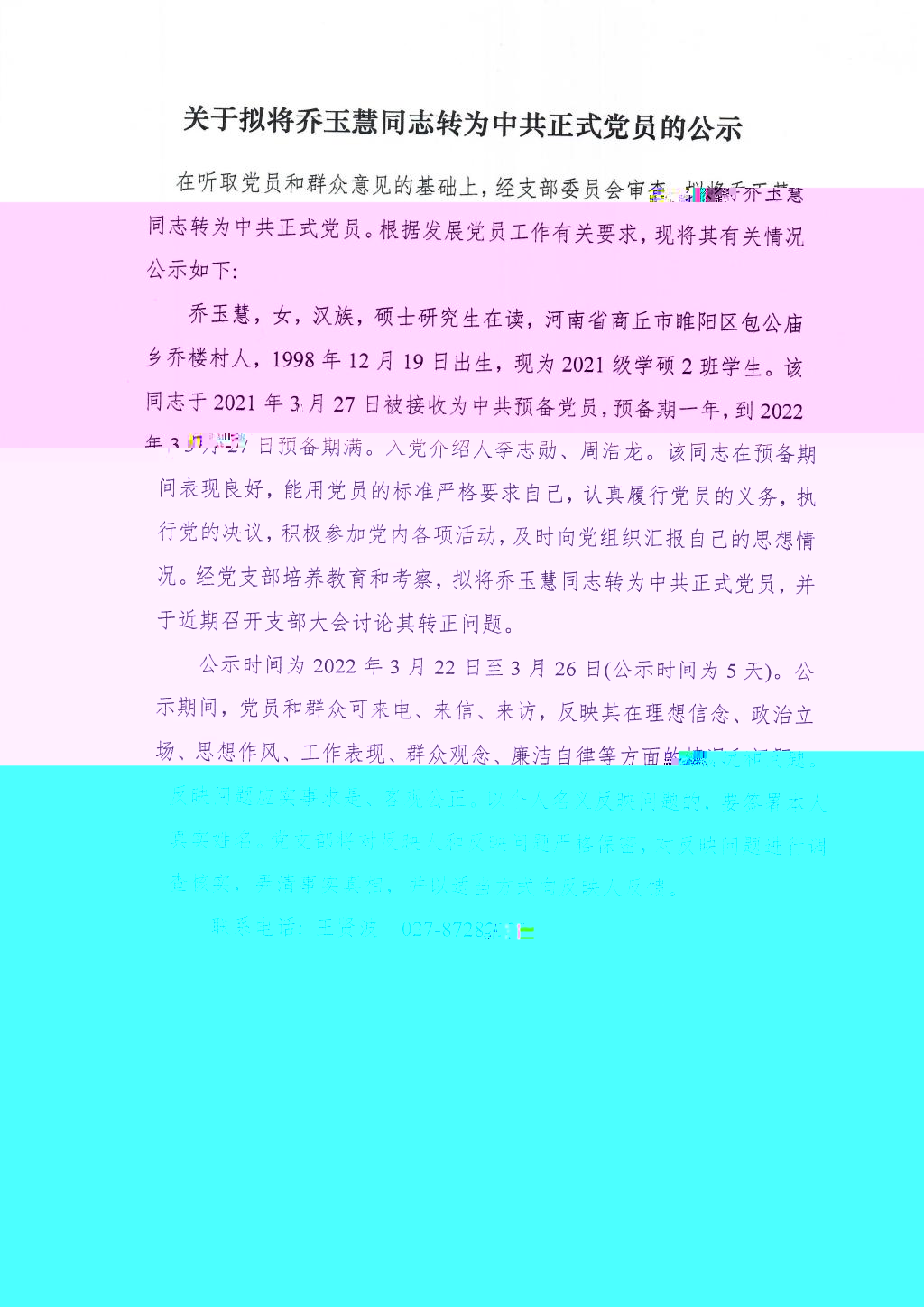 【研】關于拟将喬玉慧同志轉為中共正式黨員的公示