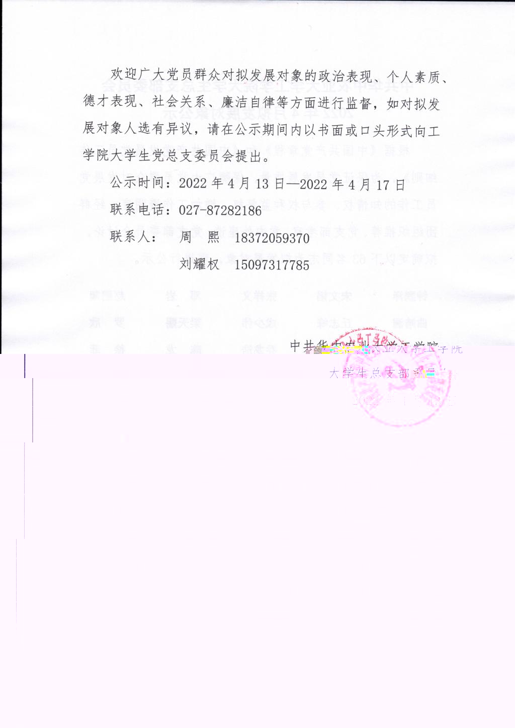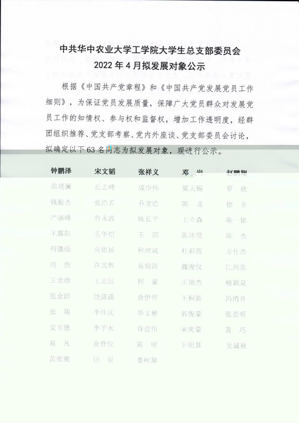 中共yl7703永利大學生總支部委員會2022年4月拟發展對象公示