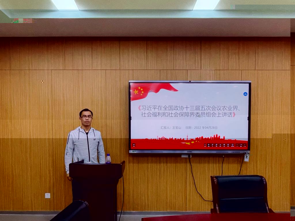 王寶山同志領學習近平總書記在全國政協十三屆五次會議農業界、社會福利和社會保障界委員組會上的重要講話,他談到,社會福利和社會保障事關百姓福祉、社會公平,是治國安邦的大問題。作為一名學生黨員,我們要時刻牢記習近平總書記的諄諄囑托,努力提高自己為人民服務的本領,日常生活中主動關心身邊需要幫助的人,把人民是否真正得到實惠、人民生活是否真正得到改善、人民權益是否真正得到保障作為衡量一切工作成效的标準。