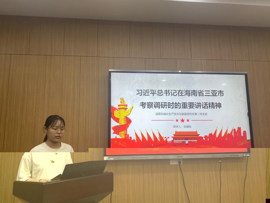 劉靖怡同志領學習近平總書記在海南省三亞市考察調研時的重要講話精神時分享到,習近平總書記在崖州灣種子實驗室進行考察時,關心中國人民的菜籃子安全,作為研究生黨員,我們應該将汗水播撒在祖國大地上,用科技武裝農業生産,保障糧食安全,針對當前農業機械的短闆項目集中攻關,努力實現在鄉村振興中建功立業的目标。