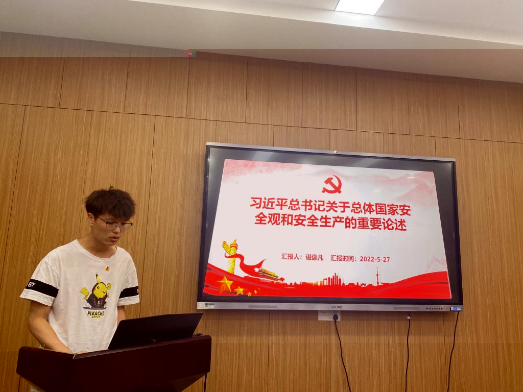 谌逸凡同志帶領支部成員解讀習近平總書記關于總體國家安全觀和安全生産的重要論述時講到,習近平總書記關心民生福祉,對總體國家安全觀和安全生産做出一系列重要論述。作為當今時代潮流中的一份子,我們更應該緊跟習近平總書記的步伐,昂首挺胸,闊步向前。站在“兩個一百年”奮鬥目标的曆史交彙點,我們面臨的内外因素比曆史上任何時候都複雜,隻有樹牢安全意識,做實安全防護,才能在黨的百年華誕之際交出理想的時代答卷。