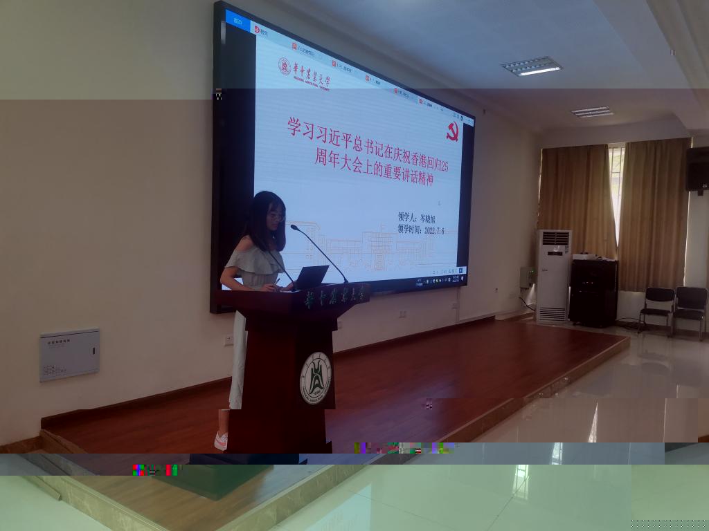 畜禽水産工程技術與裝備研究生第二黨支部書記岑曉旭在領學習近平總書記在慶祝香港回歸25周年大會上的重要講話精神時,先以從香港被分割出祖國直到回歸祖國懷抱的一段曆史事實回顧過去,又以香港回歸後在黨和國家的領導下良好的發展肯定了“一國兩制”方針的重要曆史意義。接着她又對未來提出希望,并說道:“青年興,則香港興;青年發展,則香港發展;青年有未來,則香港有未來。我們殷切希望,每一個香港青年都投身到建設美好香港的行列中來,用火熱的青春書寫精彩的人生。”