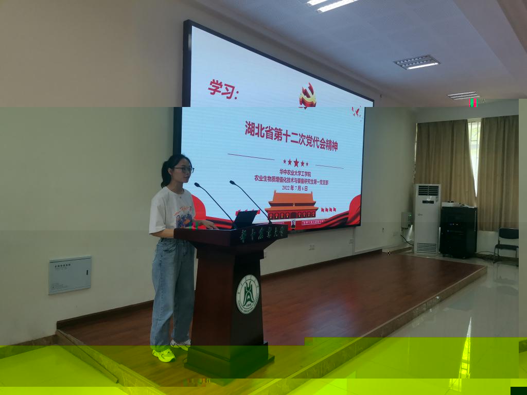 農業生物質增值化技術與裝備研究生第一黨支部副書記韋詩慧在領學湖北省第十二次黨代會精神時,從會議背景、“過去五年怎麼樣”、“未來五年怎麼幹”三個闆塊進行闡述和講解。她列舉過去五年黨的政治建設、疫情防控湖北保衛戰等七大成就,并結合黨的方針和政策指出未來五年我們要準确把握新發展階段湖北面臨的新形勢新任務,努力構建新發展格局,完整準确全面貫徹新發展理念。