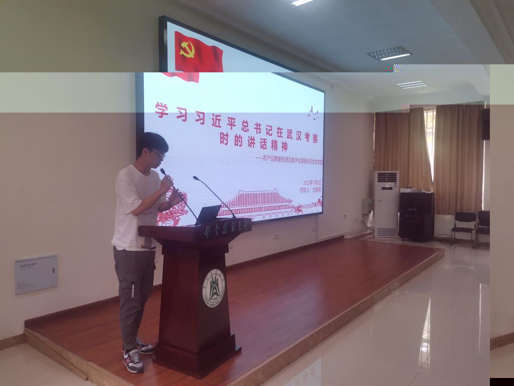 農産品智能檢測及數字化裝備研究生黨支部書記劉瑜明在領學習近平總書記在武漢考察時的講話精神時回顧習近平總書記在武漢新港陽邏集裝箱港區“卷褲腿趟積水”調研、習近平總書記武漢烽火科技集團調研以及習近平總書記在抗擊疫情的關鍵時刻專門赴武漢慰問當地人民的事迹,并向黨員同志們表示,我們黨始終與人民站在同一戰線,持之以恒地為人民服務。同時他談到,在武漢考察期間習近平總書記強調,我們必須完整、準确、全面貫徹新發展理念,深入實施創新驅動發展戰略,把科技的命脈牢牢掌握在自己手中,在科技自立自強上取得更大進展,不斷提升我國發展獨立性、自主性、安全性,催生更多新技術新産業,開辟經濟發展的新領域新賽道,形成國際競争新優勢。