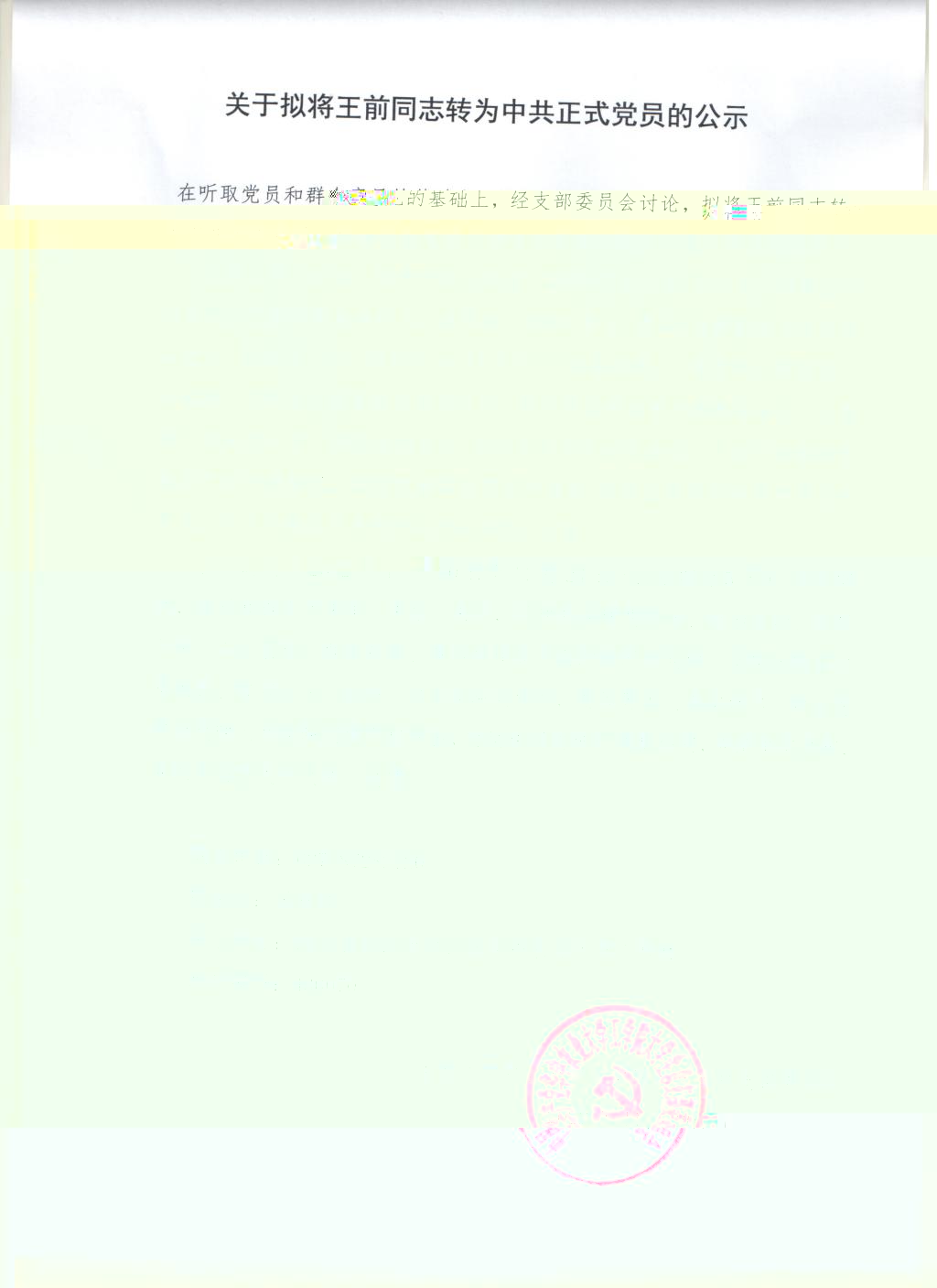 【研】關于拟将王前同志轉為中共正式黨員的公示