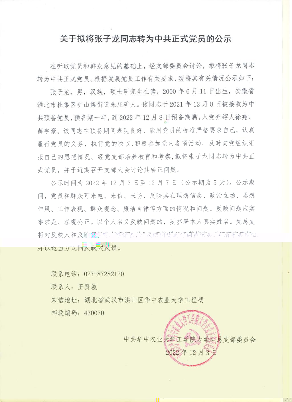 【研】關于拟将張子龍同志轉為中共正式黨員的公示