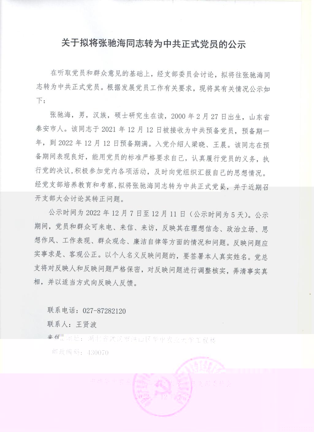 【研】關于拟将張馳海同志轉為中共正式黨員的公示
