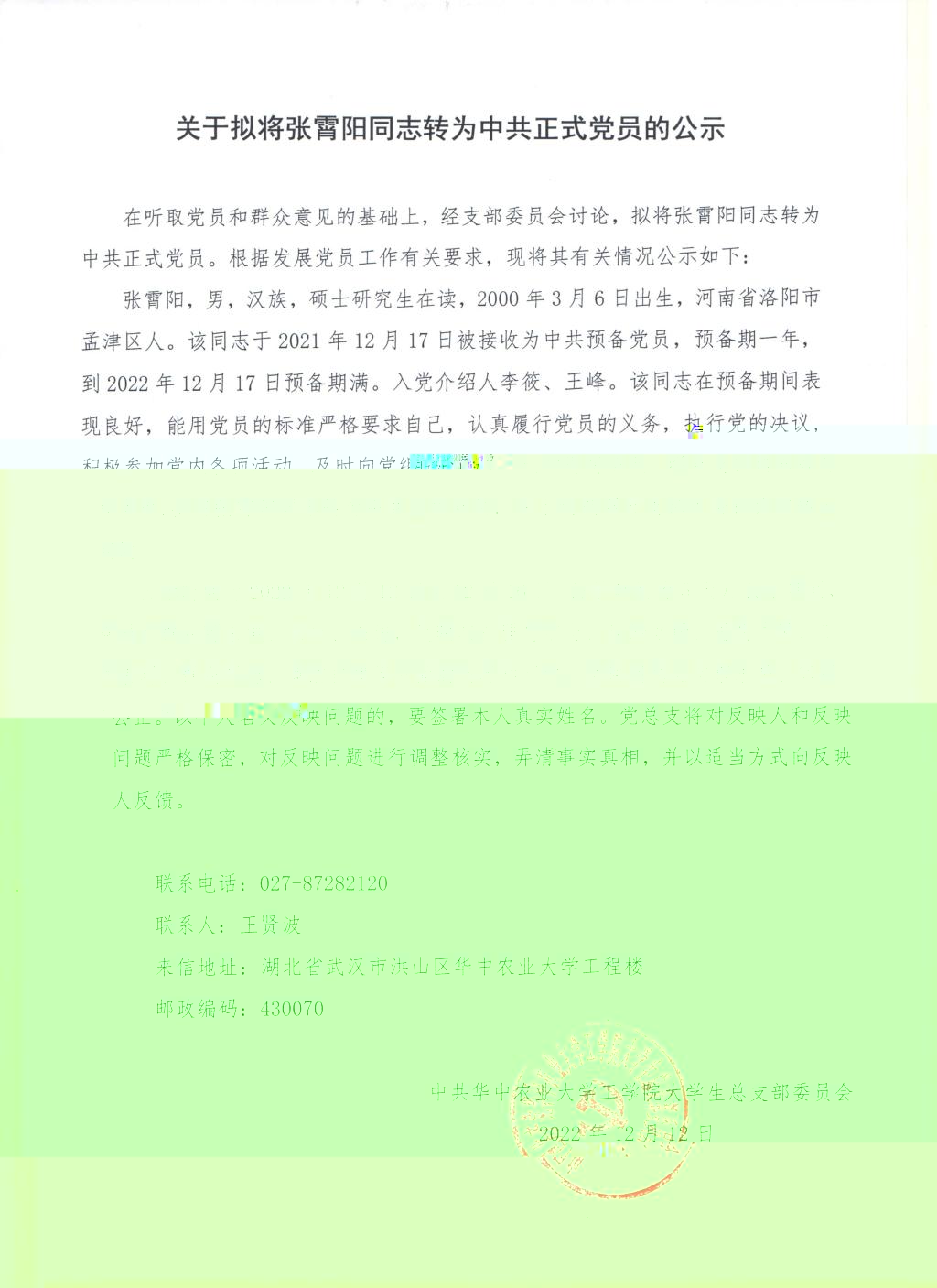 【研】關于拟将張霄陽同志轉為中共正式黨員的公示