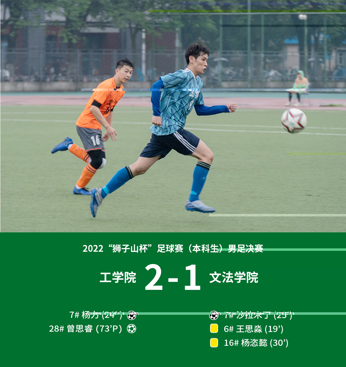 南湖新聞網訊(記者 徐行 學通社記者 王景攀)5月28日下午,2022“獅子山杯”足球賽在東運動場迎來收官。在本科生男子組決賽上,yl7703永利男足與文法學院男足在雨中上演激情碰撞。最終,yl7703永利男足2:1戰勝文法學院男足,獲得冠軍,文法學院男足獲得亞軍。
