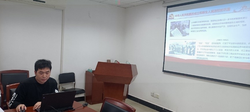 馬克思主義學院宣講員宋雨同志做了 “百年黨史的光輝曆程”專題報告,報告以開天辟地、改天換地、翻天覆地、驚天動地四個章節展開,分别講述了中國共産黨發展曆程的四個階段。屈肖凱、鄢錢同志分别領學了《中國共産黨簡史》第五、六章。王益健同志分享到,中國共産黨為什麼行?中國共産黨為什麼能?今天的研讨會就可以嘗試找到一些答案,那就是中國共産黨始終代表着中國最廣大人民的根本利益,作為黨員要與人民群衆站在一起,始終代表人民群衆走在建設社會主義社會的前列。